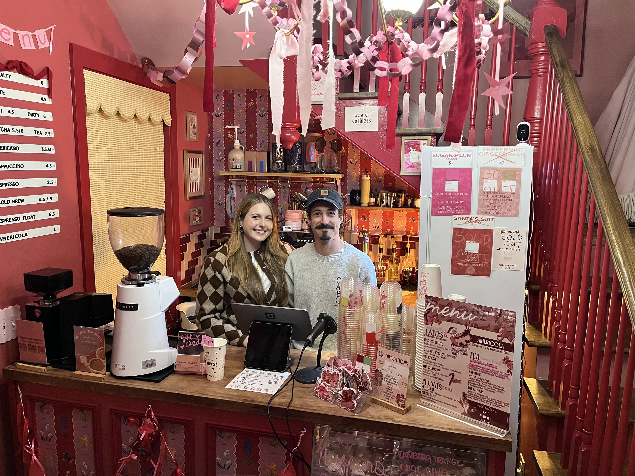 May 24th, 2025 marked the grand opening for the caffeinated side of the Canary Yellow business. The one-of-a-kind “nook” coffee shop was born with the hope of covering bills in the early days of renovations to the inn, which was yet to open. They describe the coffee counter as “Harry Potter style”, tucked beneath the winding pink stairwell in the foyer of the historic home.