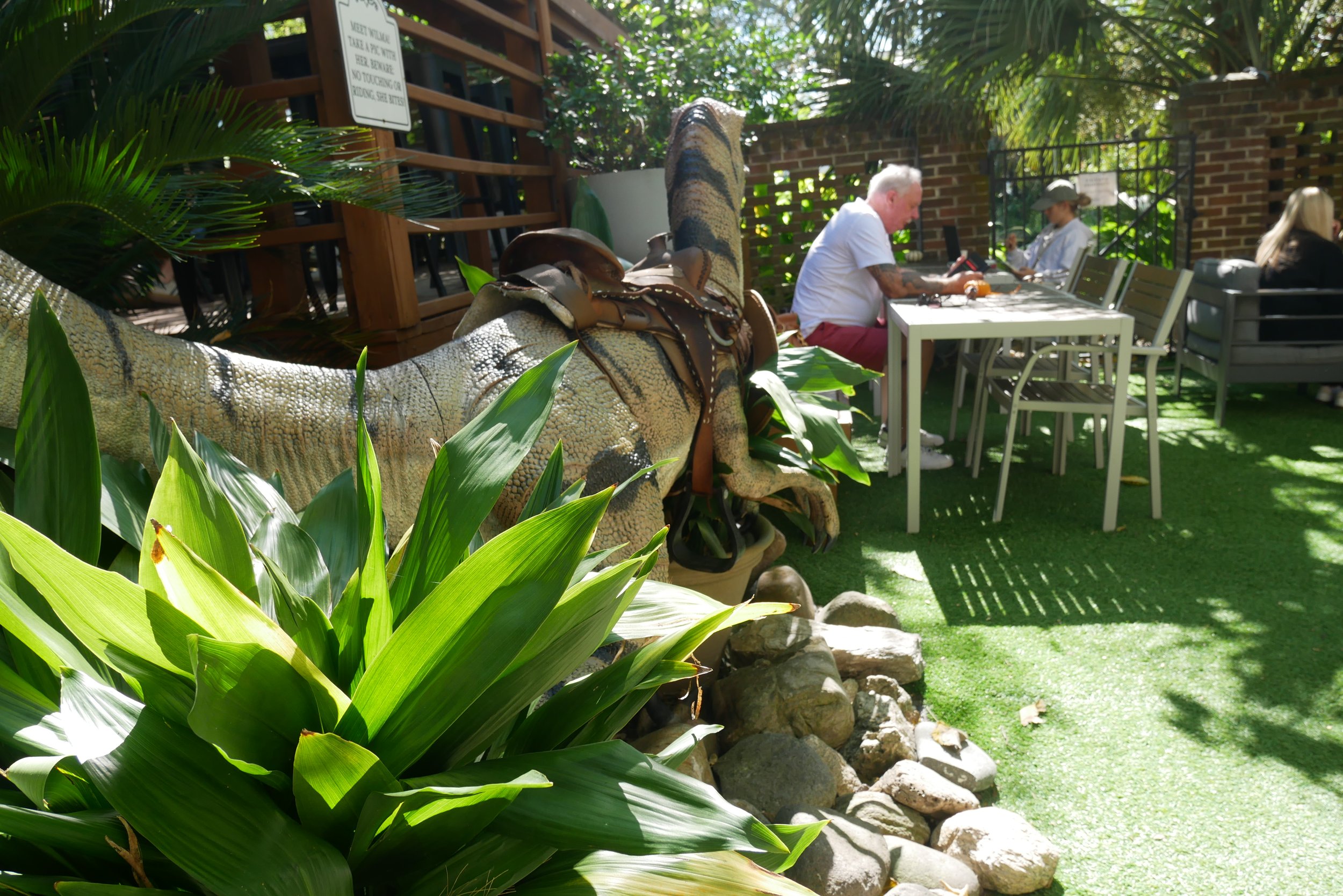 In a play on “coffee grounds” and in reference to the hidden garden behind the storefront, “Hidden Grounds” was decided on as the name prior to development of the logo. The team landed on dinosaur themed branding simply to catch more eyeballs, since it matched the jungle-laden backyard area. A cowboy was also incorporated into the logo to pay homage to Josh and Cait’s dad, a “Marlboro Man” who worked for Phillip Morris for 30 years.